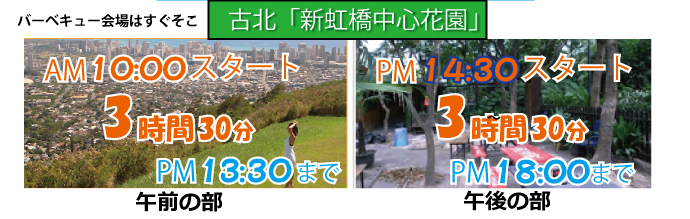 BBQ:昼の部11:00 - 15:00 / 夜の部16:00 - 20:00/